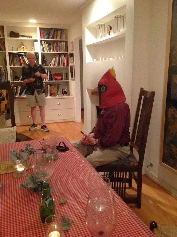 However, I treasure most his willingness to play. I have pictures to prove it. Each time he would surprise me. Like the time I put a cardinal mask over his head and he seemed quite amused as he sat for his formal portrait. Or the time at one of our annual retreats at The Hacienda when Ruby spun him at wild speed in the hanging chair. When he recovered he started laughing. Thank goodness. Still a bit wobbly, but laughing.